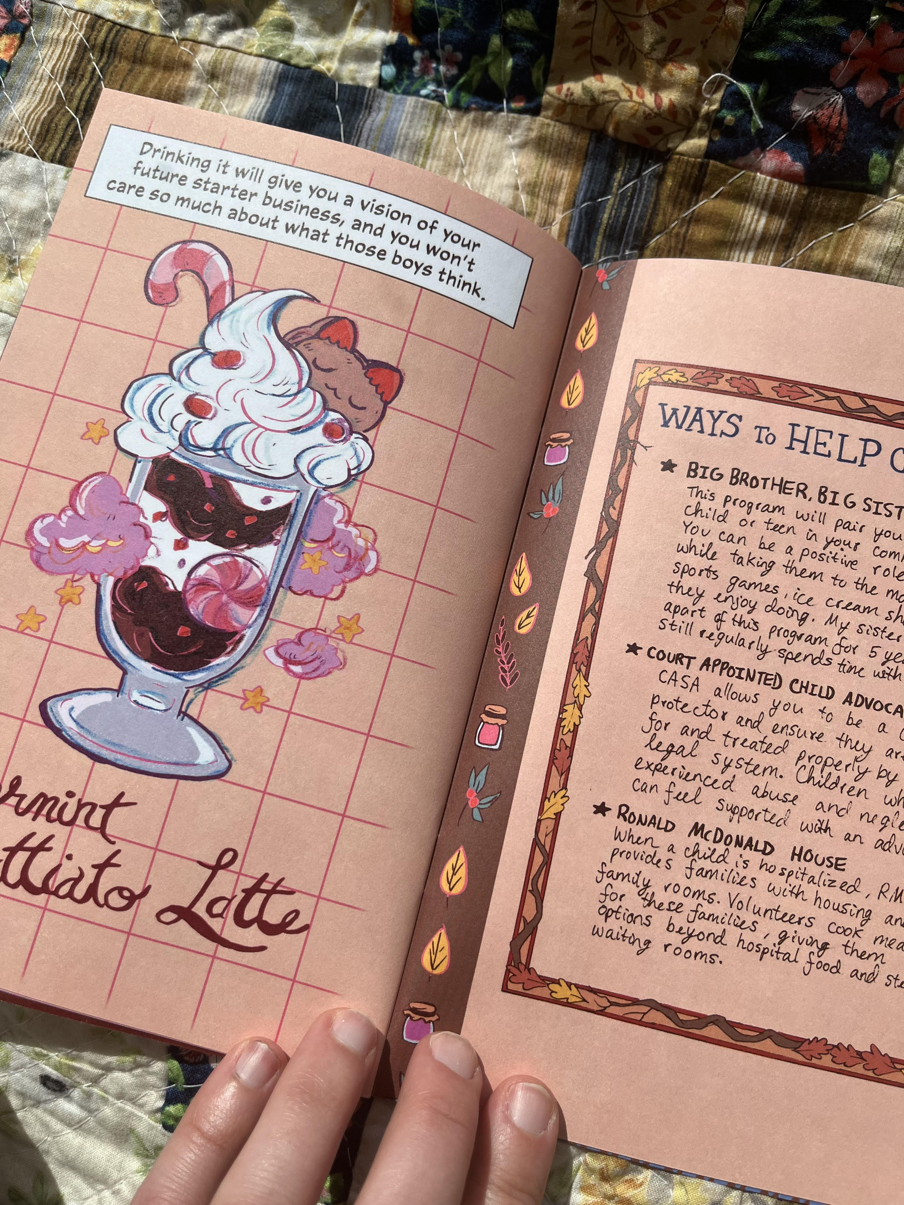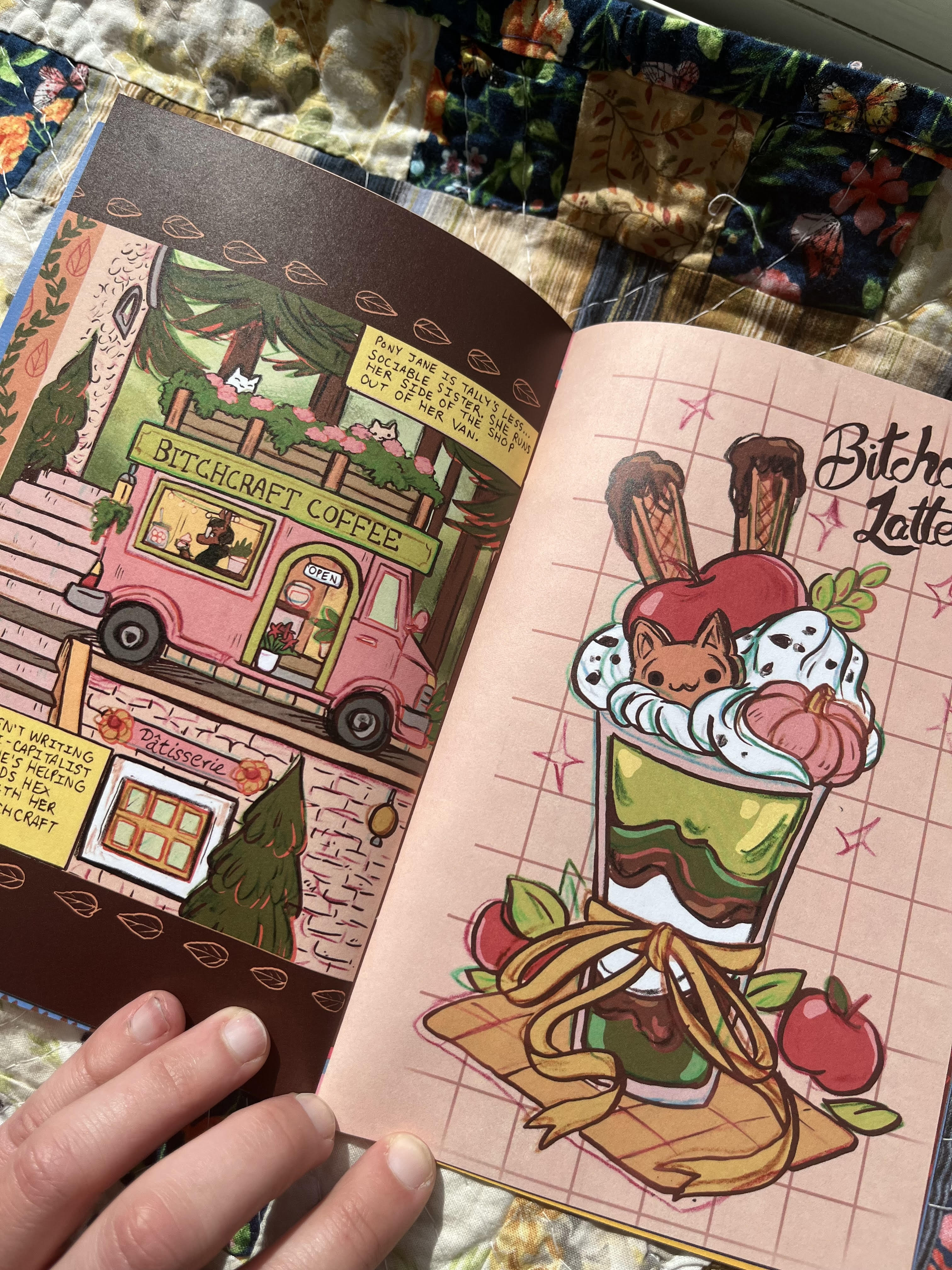 Salty Raven Milkshake is a zine with each issue centered on a single theme but unified within a fictional space: a small, magical village and safe haven for those who have been deemed witches. Each issue covers travel, culture, mythology, folklore, art, and social issues related to the chosen theme. This is the first issue, which is all about coffee: the historical relationship between coffee and magic, places with great coffee, the revolutionary Zapatistas' coffee co-ops, ways to advocate for children (exploited by the coffee industry), and military abuses (I promise coffee is related...).