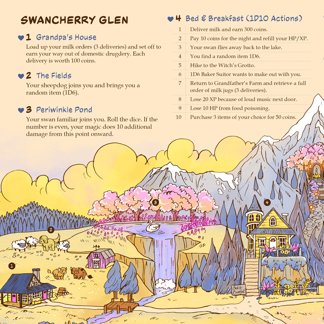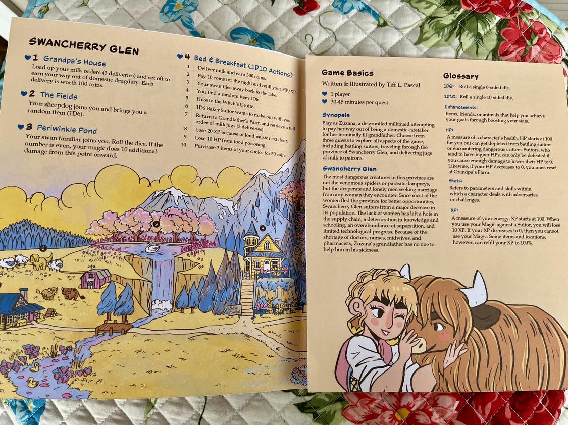 In this TTRPG, play as Zuzana, a disgruntled milkmaid attempting to pay her way out of being a domestic caretaker for her terminally ill grandfather. Lots of suitors want to win her over, but she only wants one thing--to get out of dodge and live her life. Choose from three quests to explore all aspects of the game, including battling suitors, traveling through the province of Swancherry Glen, and delivering jugs of milk to patrons.