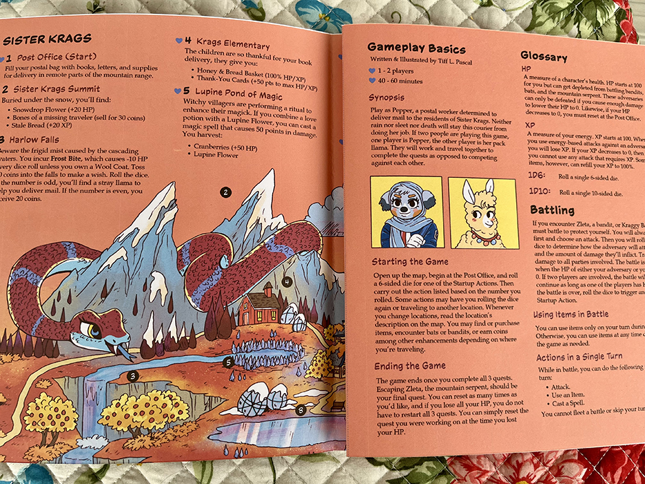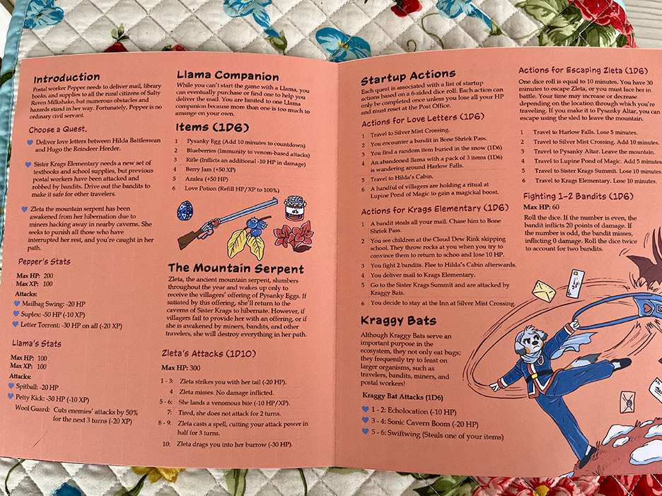 In this TTRPG, play as Pepper, a postal worker determined to deliver mail to the residents of Sister Krags. Neither rain nor sleet nor death will stay this courier from doing her job. This game can be played solo or with one other person.