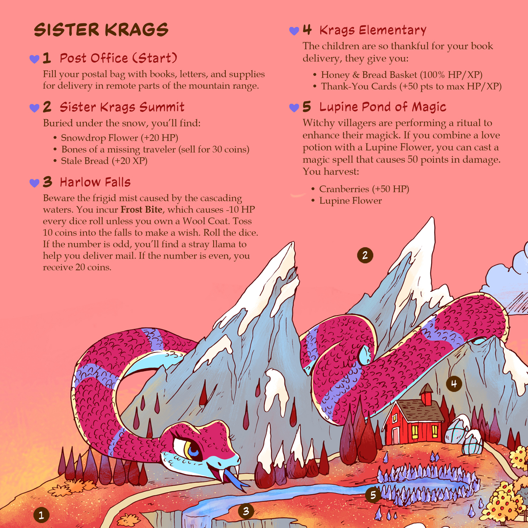 In this TTRPG, play as Pepper, a postal worker determined to deliver mail to the residents of Sister Krags. Neither rain nor sleet nor death will stay this courier from doing her job. This game can be played solo or with one other person. No other materials are necessary except a dice and pen/paper to track damage. You will receive a PDF of the 8-page booklet.